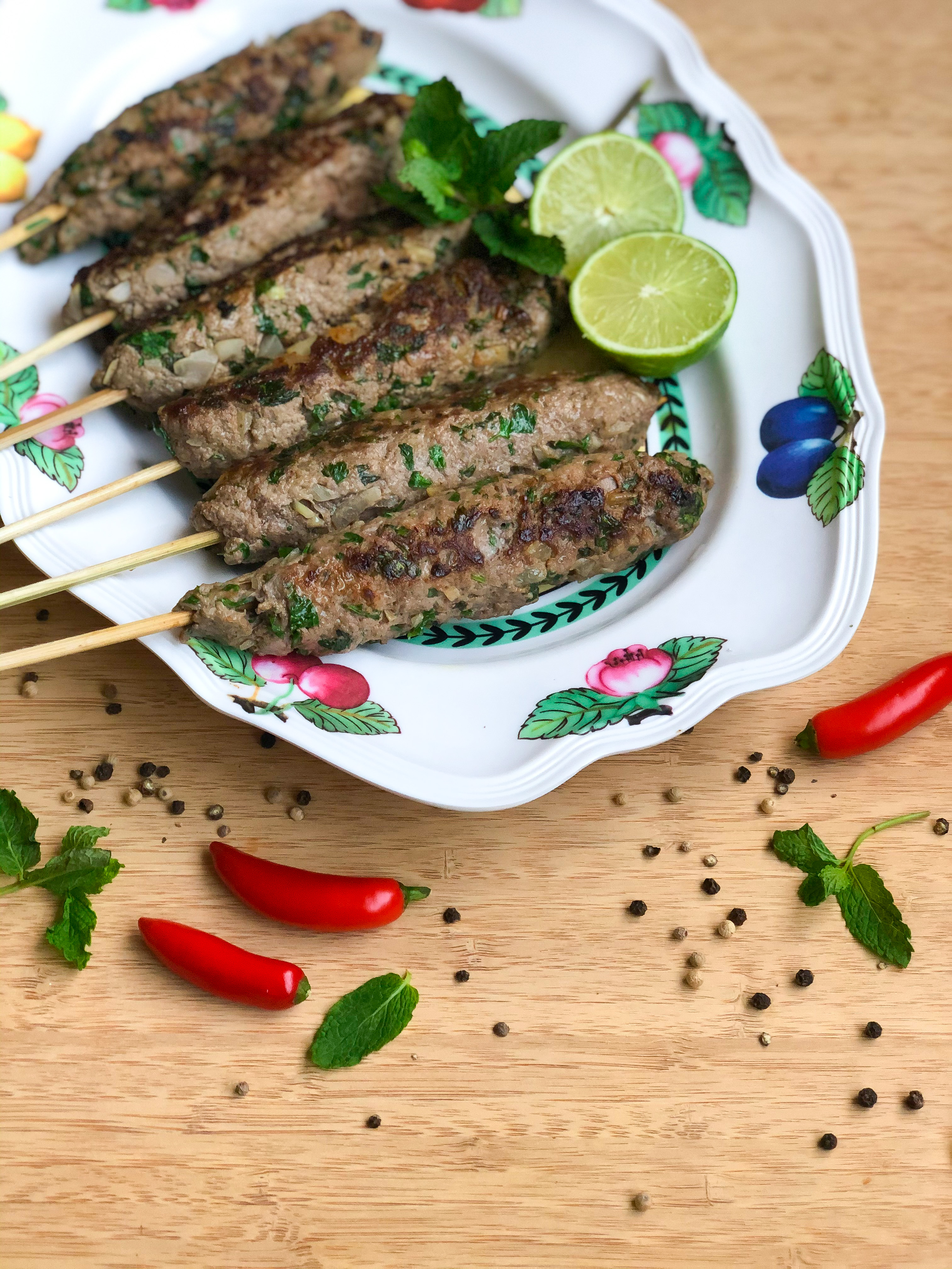 Retire os espetos da água. Com as mãos úmidas, modele as porções de carne ao redor de cada espeto – aperte delicadamente para as kaftas ficarem presas no palito.