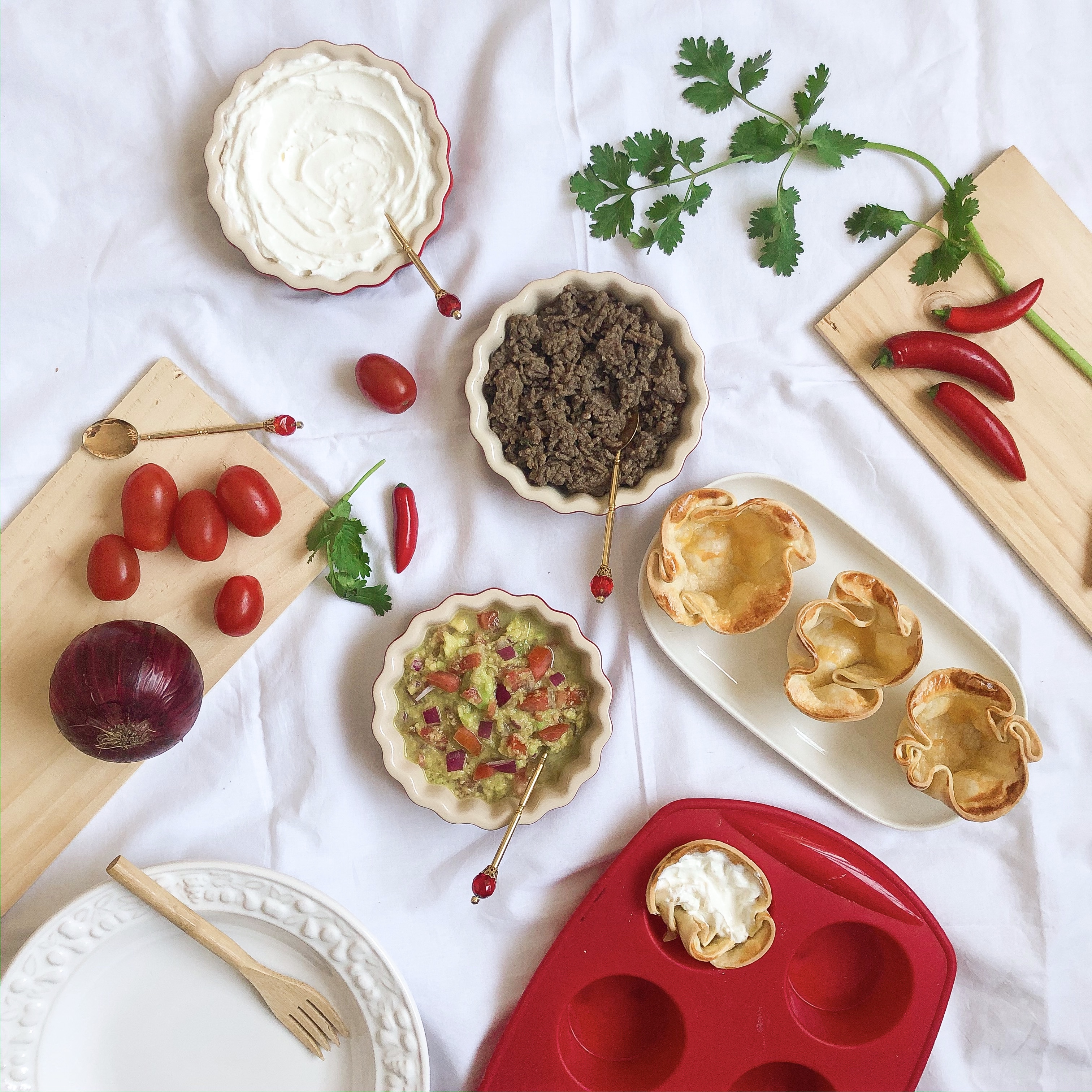 Depois que os pastéis estiverem assados, coloque um pouquinho de carne moída na base (essas que a gente tem pronta no freezer, aqui em casa virou obrigatório). Coloque uma camada de coalhada (utilizei aquela pronta do Saj). Depois por cima, finalize o pastel com a guacamole.