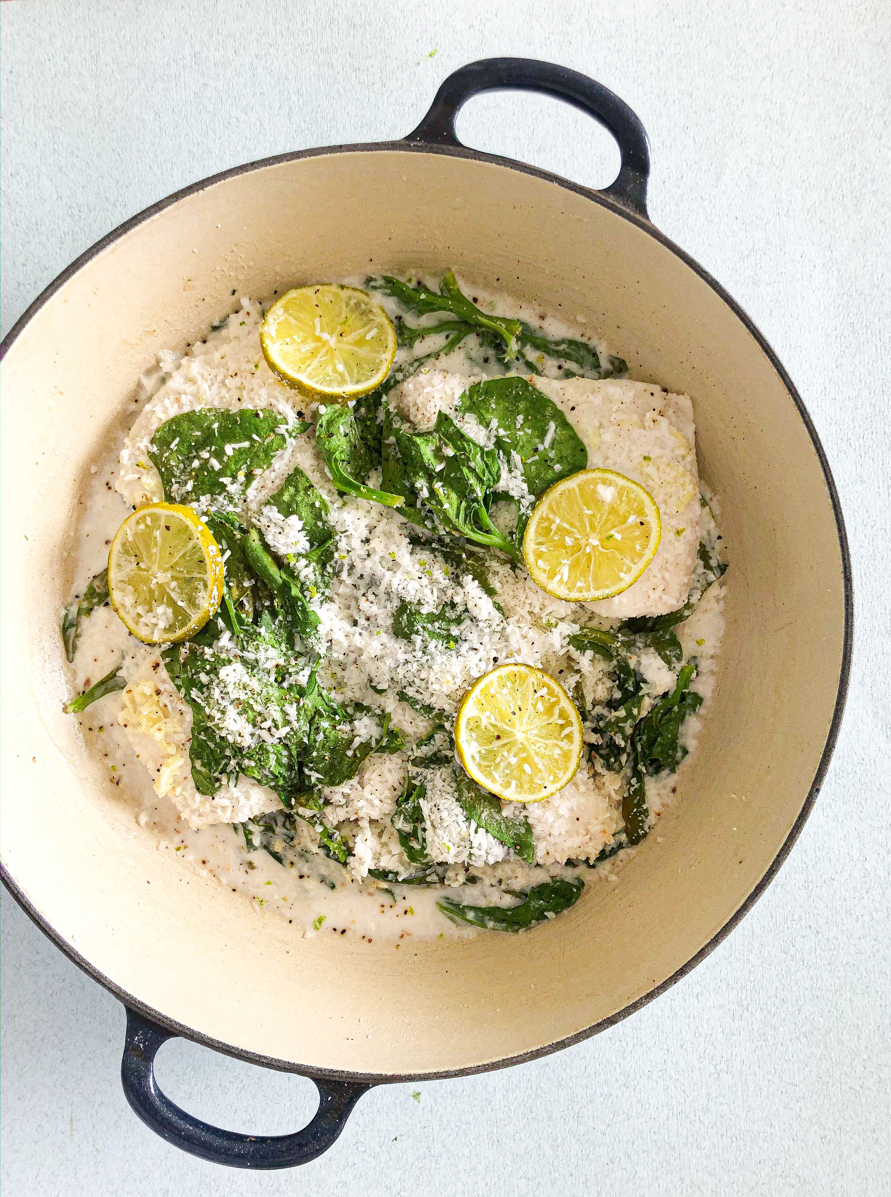 Em uma tigela grande, tempere o peixe com o suco de limão, sal e o gengibre. Em uma panela de cozimento a vapor, arrume o espinafre cru. Tempere com sal e polvilhe com um pouco de coco por cima. Coloque por cima os pedaços de peixe. Coloque em cima dos peixes as rodelas de limão e salpique com o coco restante. Jogue o leite de coco (essa parte de por leite de coco eu não mostrei no vídeo, coloque pra não ficar seco). Deixe cozinhar em fogo médio por mais ou menos 20 minutos.