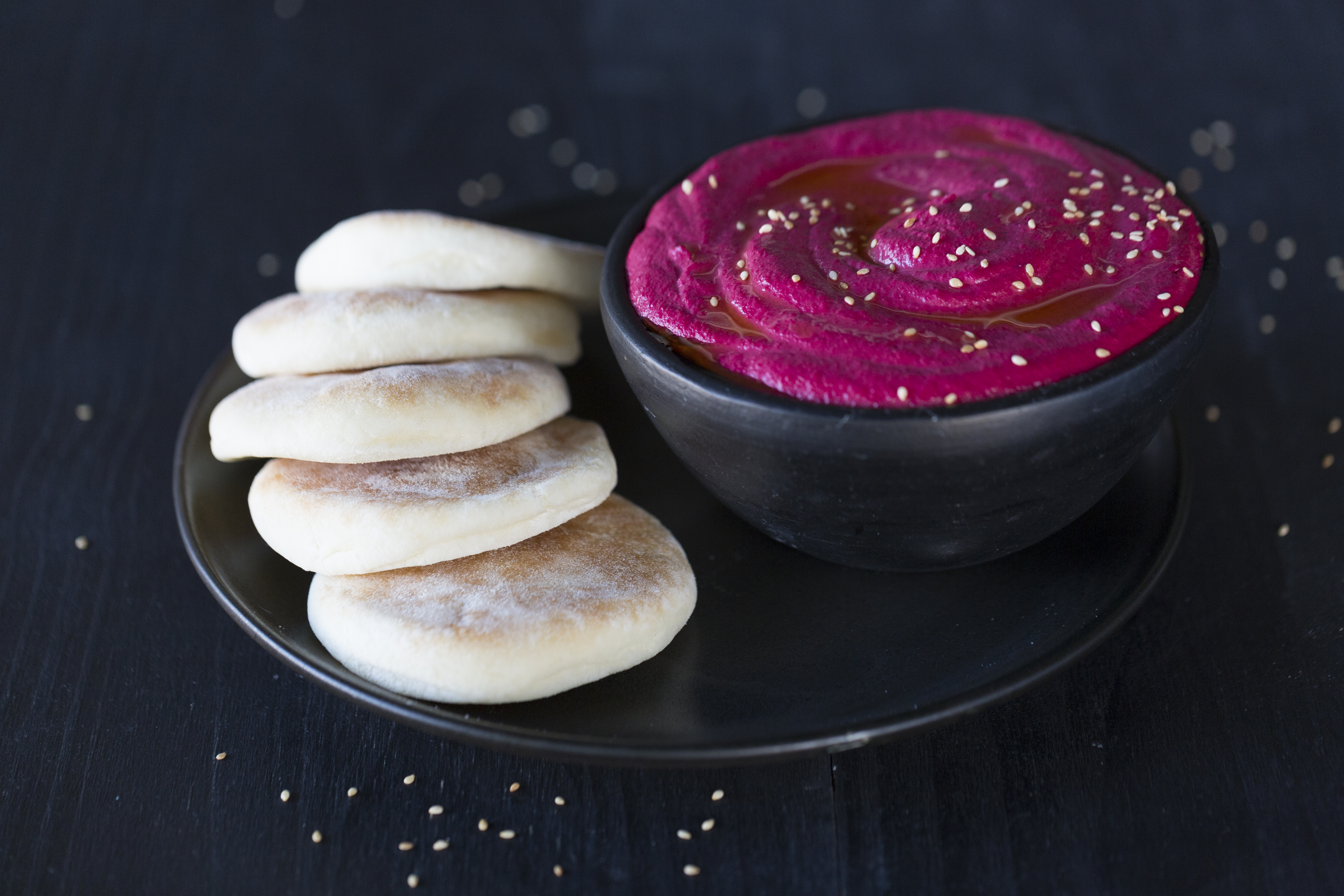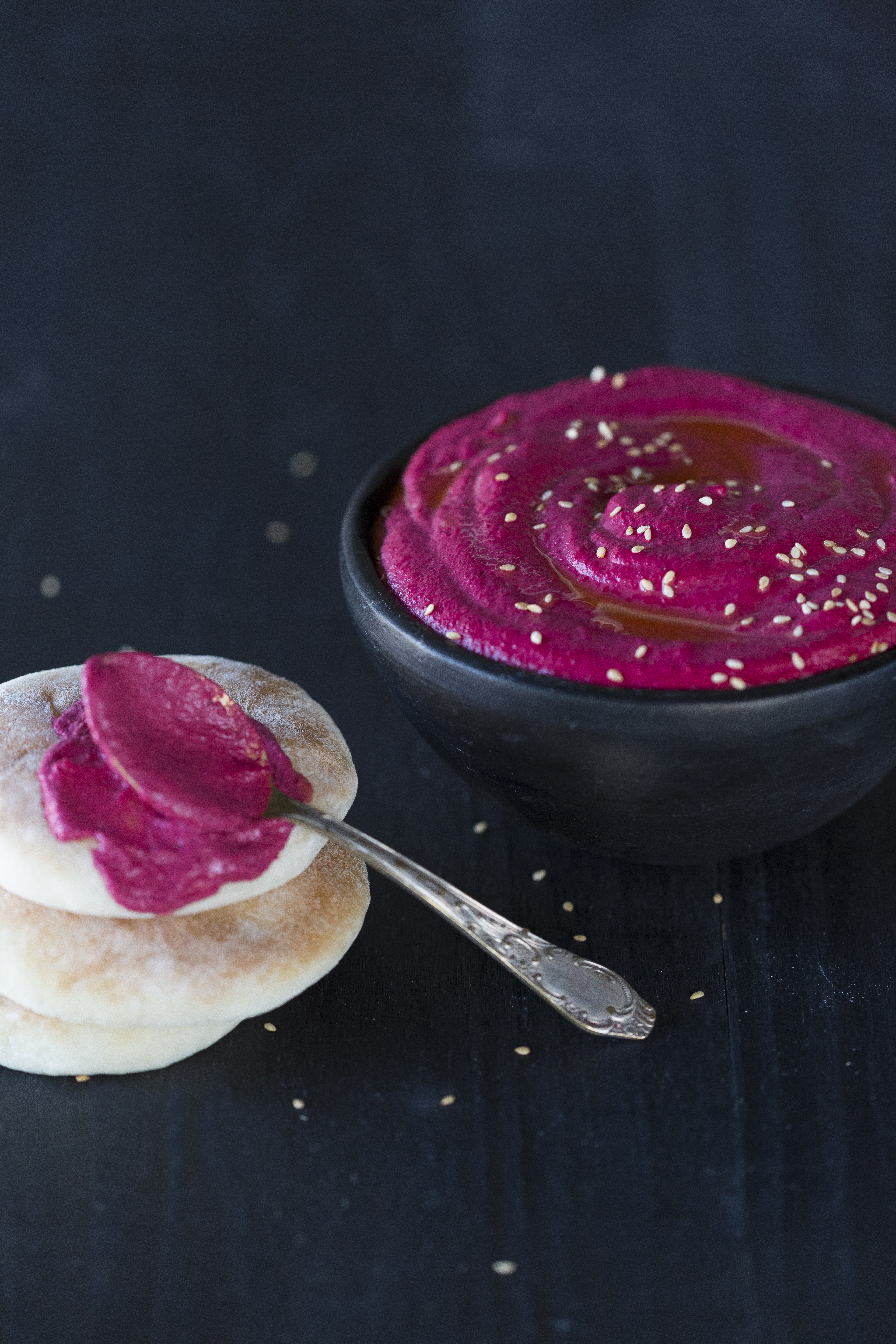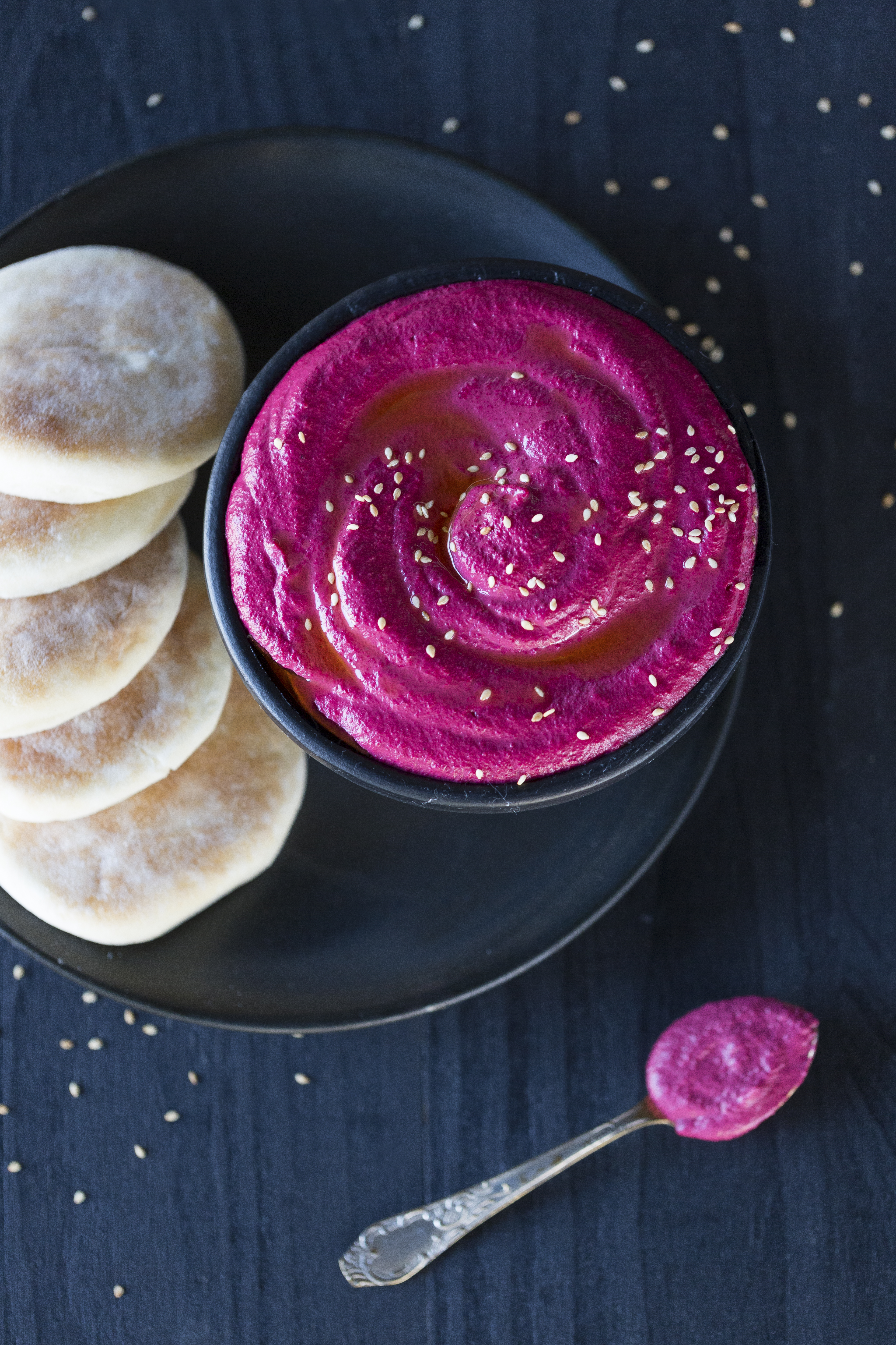 Bata a beterraba no liquidificador, o tahine, suco de limão, alho e cubos de gelo.
