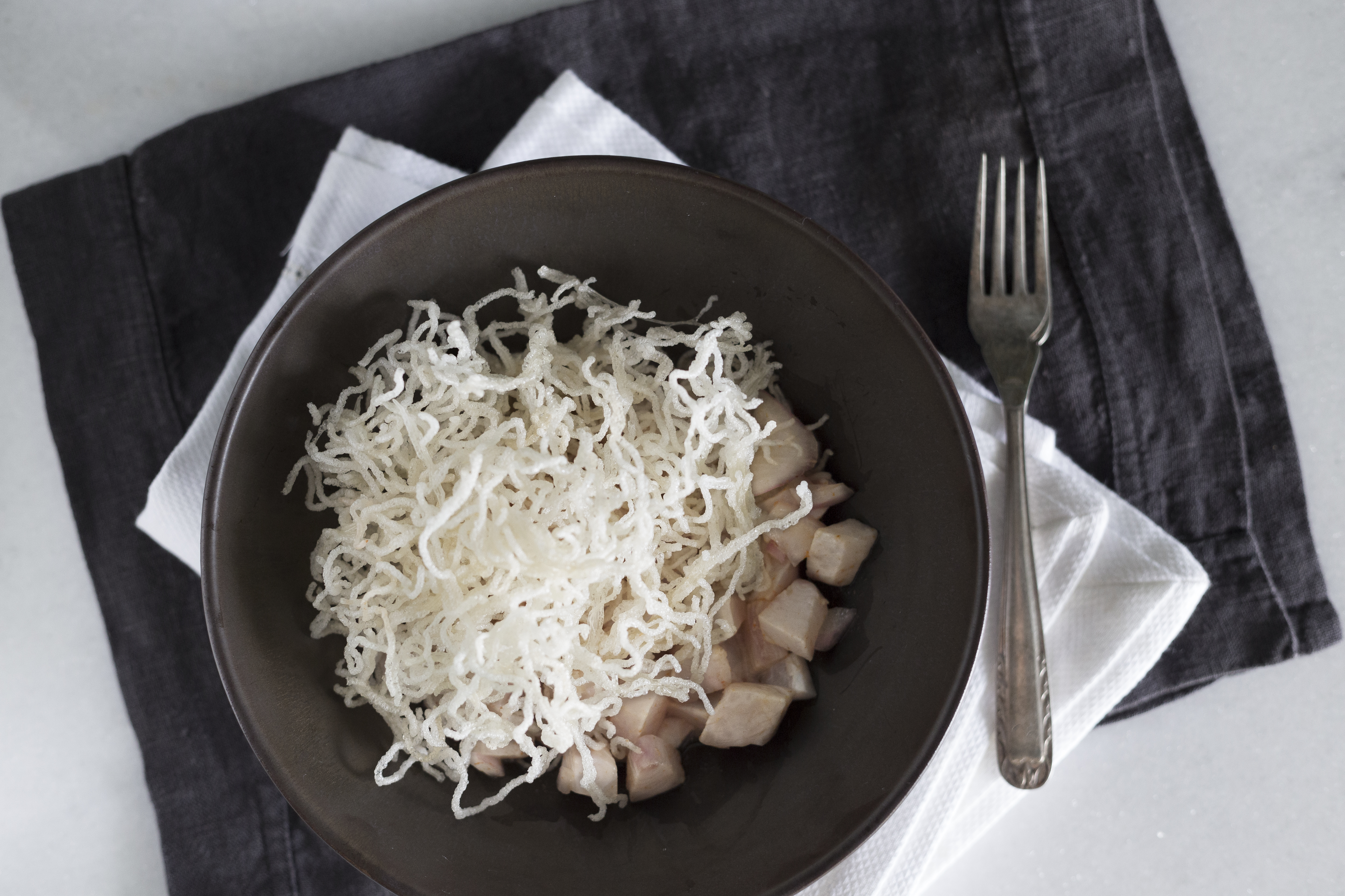 Esquente o óleo e frite o macarrão de pouco em pouco por 3 segundos.