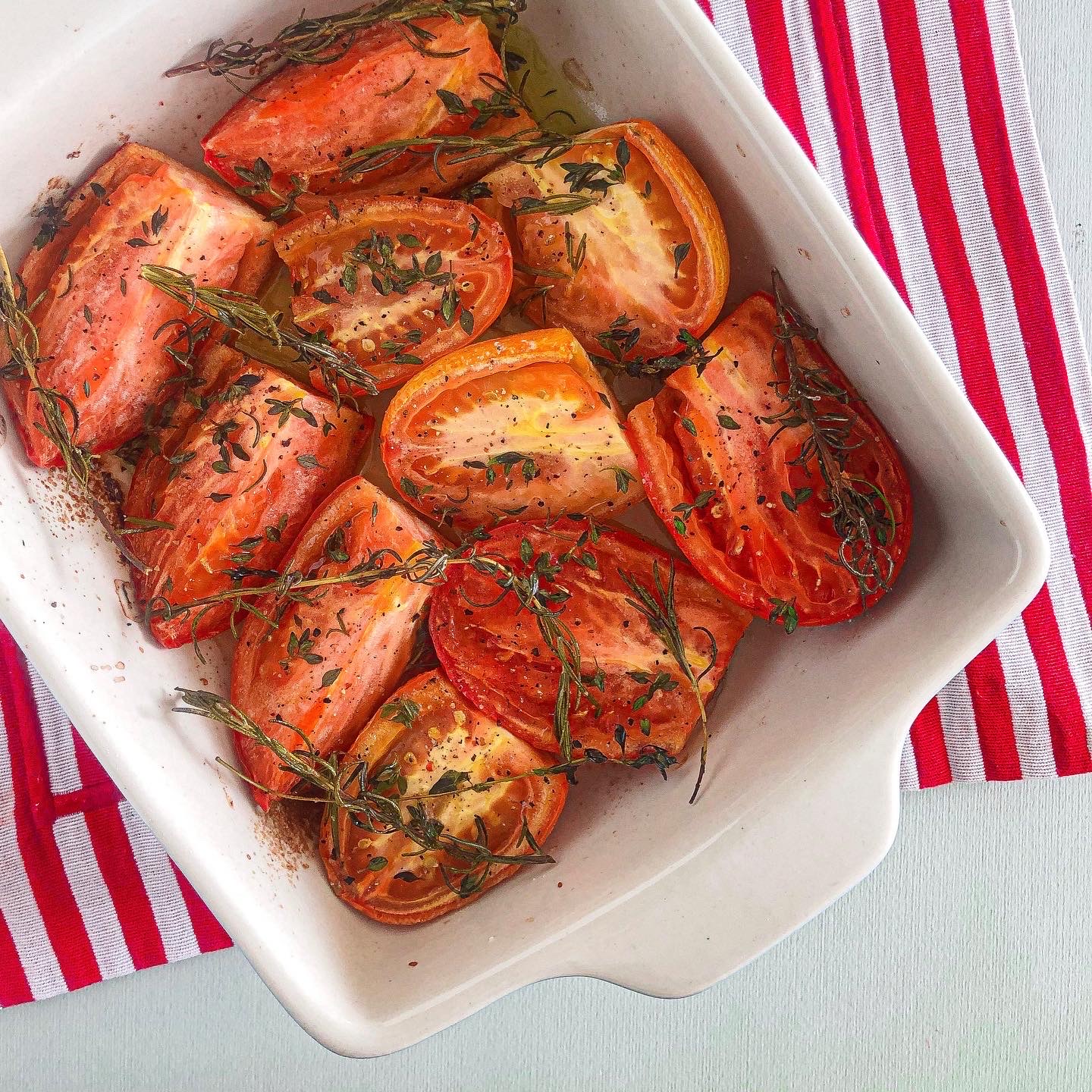 Queria registrar aqui o tanto que sou apaixonada por tomates assados! Sempre vario a forma de fazer, esse daqui coloquei sal, azeite, pimenta-do-reino, tomilho e alecrim. Deixei assando por mais ou menos uma hora. Gosto de servir com folhas regados com bastante azeite.