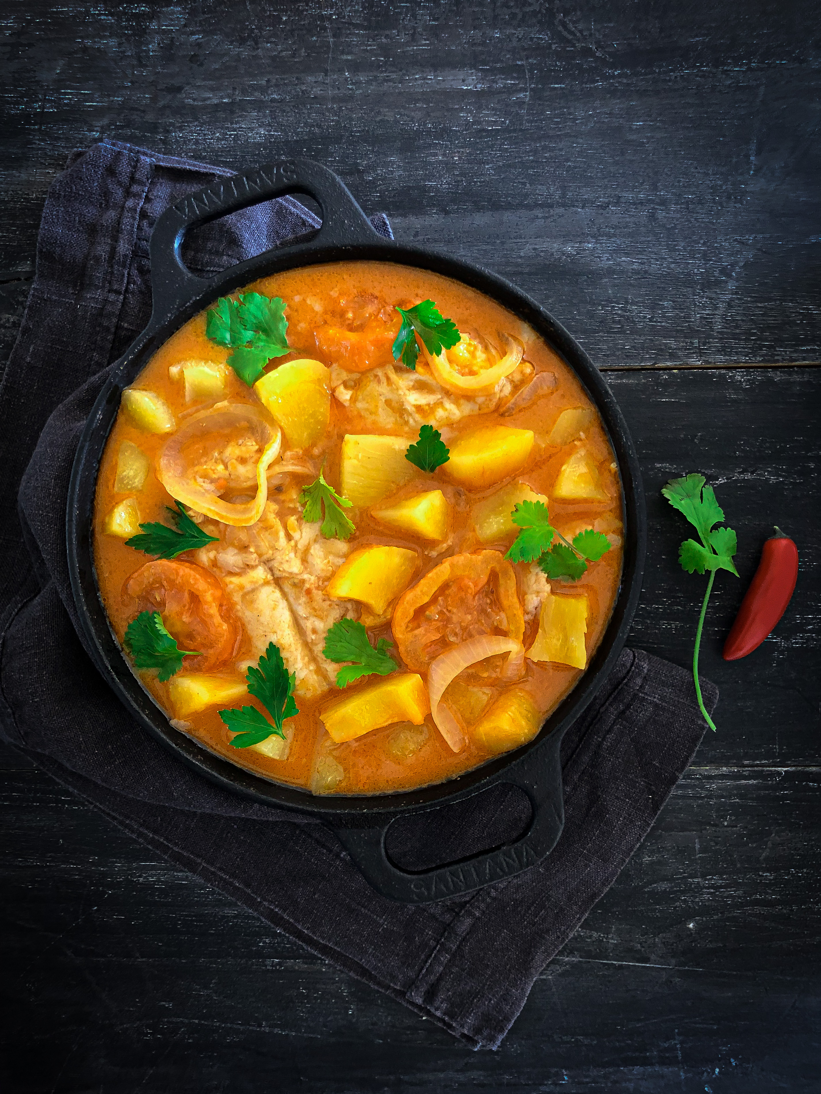 Monte camadas: cebola, mandioca, peixe, tomates em rodelas. Jogue sal, pimenta e repita o processo até que complete a panela.